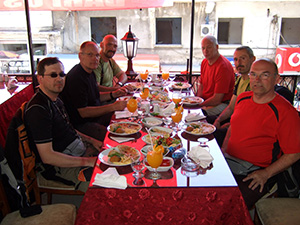 Wir fahren wieder auf Nebenstraßen, in einem Dorf ist Markttag, ein LKW verstellt den Weg und wir machen Pause. Die Bewohner sind vorerst etwas skeptisch, doch sprechen sie mit uns. Ein Mann kann gut Deutsch, er hat in Deutschland gearbeitet. Es freut ihn, dass wir nun sein Land besuchen und er lädt uns zu einem Tee ein. Der LKW ist dan weg, wir starten wieder und es folgt wieder eine Hauptstraße. Wir fahren an einem Stausee vorbei, und wir erreichen Konya. Den Berg hinunter und wir sind im Verkehr einer Millionenstadt. Es läuft aber recht flüssig, wir umkurven die Stadt geschickt, kein Problem mit den Autofahrern, vor denen uns viele Türken im Autozug gewarnt hatten. Jetzt wieder eine lange Gerade Richtung Aksaray. In der Mitte ist die Sultanhan? Kervansaray, wir machen Pause und besuchen die Raststätte entlang der Seidenstraße. Noch ein Getränk, und es geht weiter. Wir zweigen wieder ab, wir wollen noch in das Ihlara Tal und sehen dort ein recht beeindruckende Schlucht. Ein kurzer Offroad Abstecher, Siggi ist wenig begeistert, dort dann im Ziel mit der Heimfahrt. Wir erreichen wenig später unserer erstes großes Ziel – Kappadokien. In Göreme führt uns Herbert in ein Hotel, duschen und dann ab zum Abendessen. Hier ist es mehr touristisch als die letzten Tage, wir essen gut, im Weinkeller rauchen wir noch eine Sisha und der Abend klingt fröhlich aus.